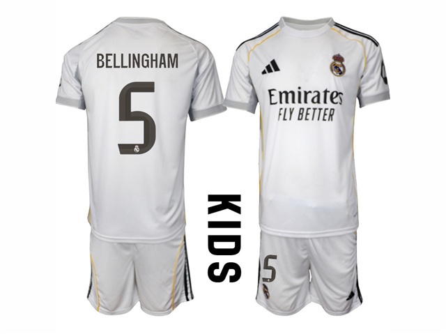 > Real Madrid CF 2025/26 Home Youth White Soccer Jersey with #5 Bellingham Printing