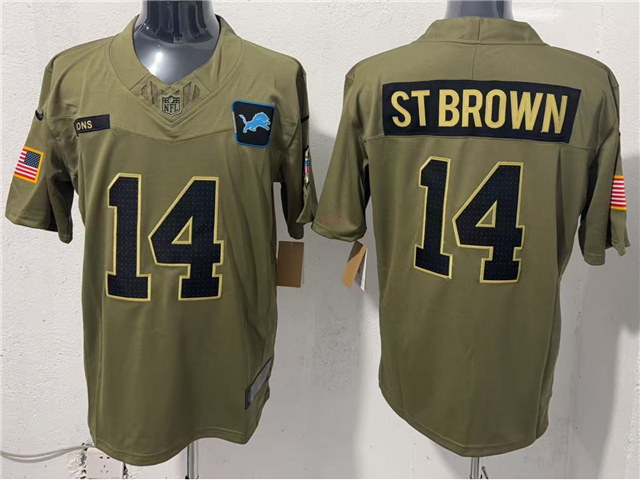 > Detroit Lions #14 Amon-Ra St. Brown Olive 2025 Salute To Service Limited Jersey