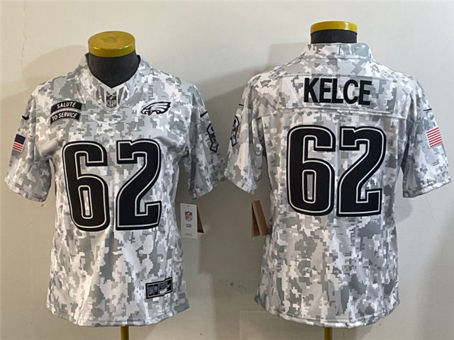 > Philadelphia Eagles #62 Jason Kelce Women's Arctic Camo 2024 Salute To Service Limited Jersey